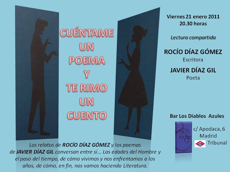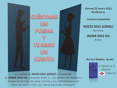 Y tras la infancia, el acto dio paso a un relato-experimento. Era nuestra sorpresa y nuestro regalo esa noche a los amigos que nos acompañaron en el "Diablos Azules". Un relato escrito ex profeso para el recital en el que se integraban mis poemas en el hilo narrativo de la prosa de Rocío.