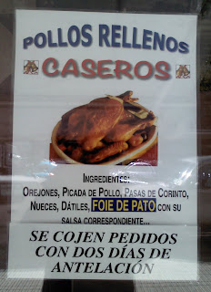 En un establecimiento de Madrid, en la calle Mauricio Legendre (¿o tal vez escribirían estos señores el nombre de este hispanista francés que da el nombre a la calle como Maurico Lejendre?) -y no daré más datos de su ubicación- me he encontrado con este cartel. La imagen jugosa de un pollo relleno casero de nueces, dátiles, orejones... con sus salsa correspondiente. Aquí puedes adquirirlo y tal como reza el cartel en su parte inferior sólo has de tener en cuenta que